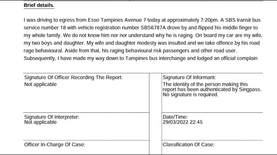 The incident, which occurred along Tampines Avenue 7 on the evening of March 29, came to light after Facebook page Roads.sg posted a video of the bus driver's behaviour.