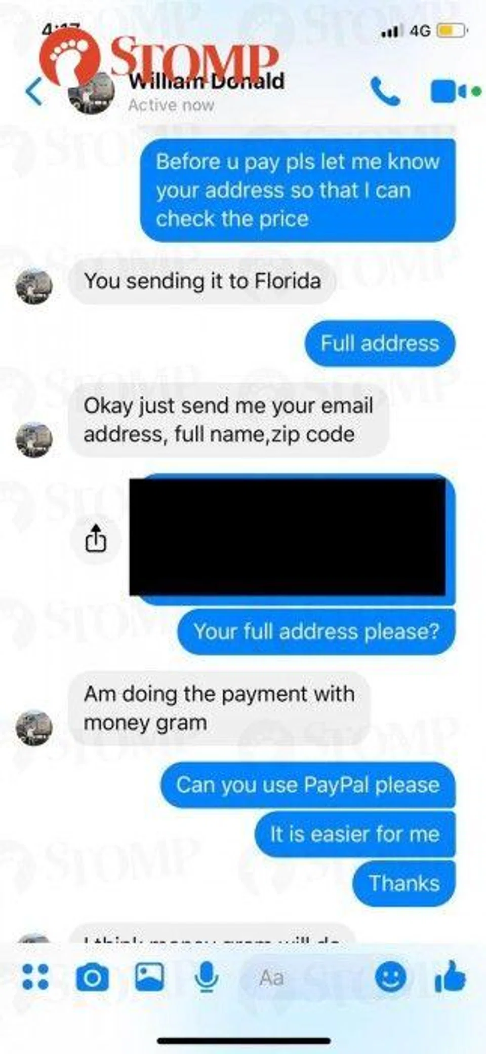 However, William did not respond when asked for the recipient's address and instead asked for the Stomper's details instead.