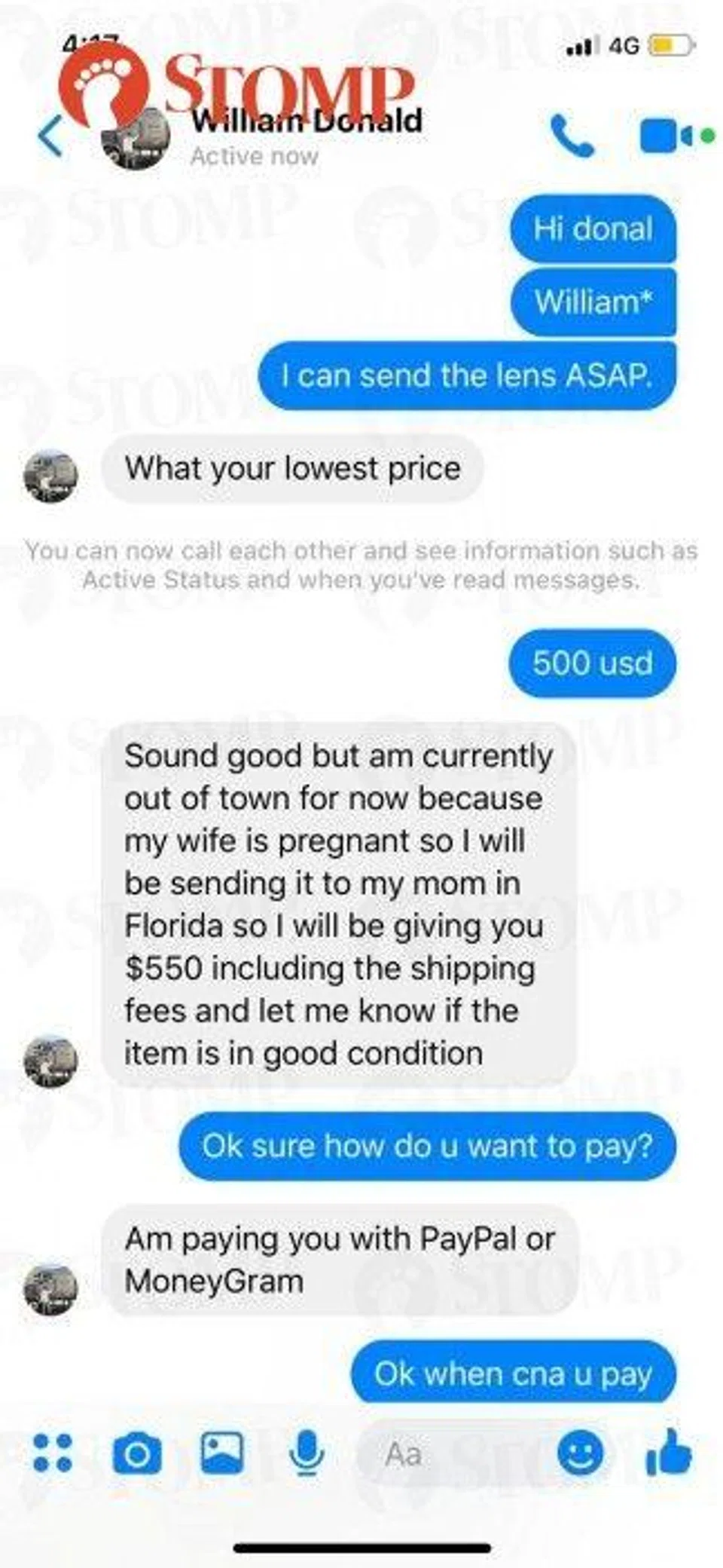 Both parties agreed on US$500 (around S$693) and William even offered an extra $50 for the lens to be shipped to his mother in Florida.