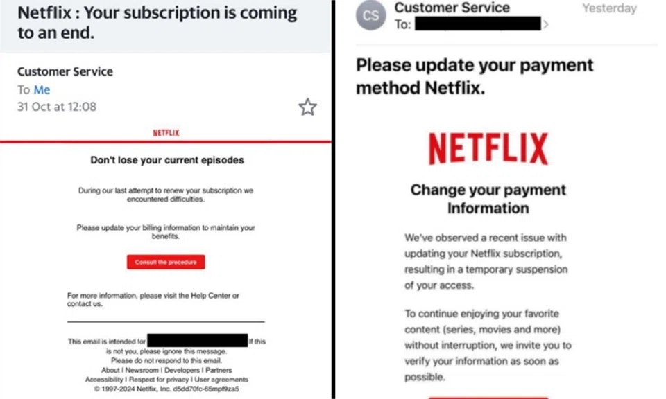 The scam victims would receive an email purportedly from Netflix, claiming that there were issues with payment or subscription which resulted in a temporary suspension of their Netflix account.
