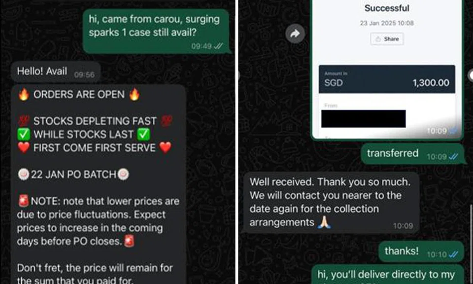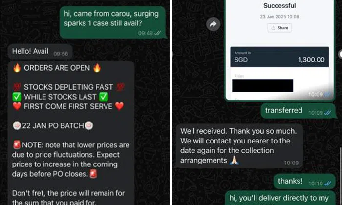 After confirming orders, victims are instructed to make payment through PayNow or bank transfers.