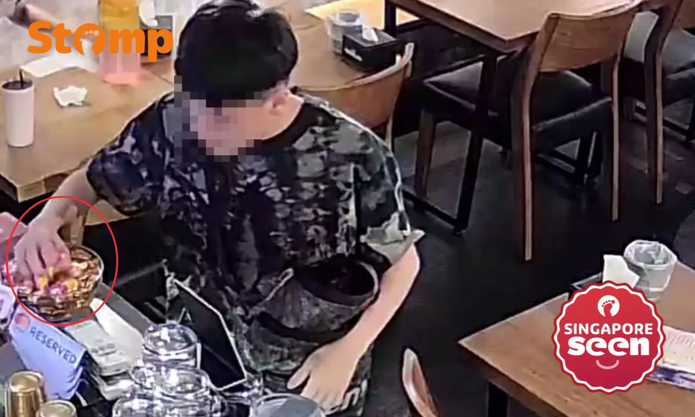 The restaurant owner, Stomper W, shared a security camera footage of the man grabbing a generous handful of haw flakes from the bowl at the payment counter and stuffing them into his bag.