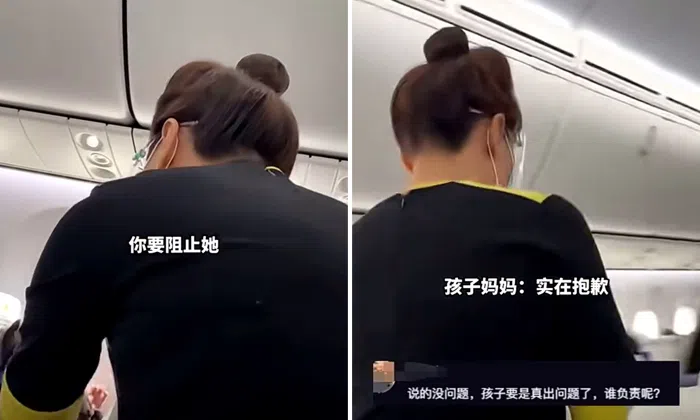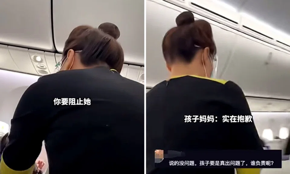The clip shows a cabin crew member - from what appears to be Scoot airlines - berating the mother, saying in Mandarin: "Don't you know it's very dangerous? I'll have to write a report if anything happens to him. And it's going to be very long."