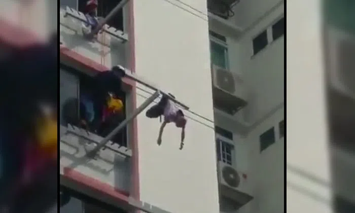 In a post shared by Facebook user Mawar Berduri on Sept 30, 2017, the elderly man could be seen hanging precariously from a rack outside an HDB flat, as officers from the SCDF (Singapore Civil Defence Force) raced to save him.