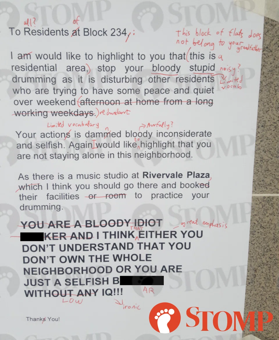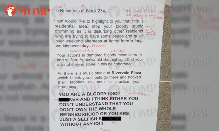 Sengkang resident who left vulgar note about "stupid drumming" gets free English lesson