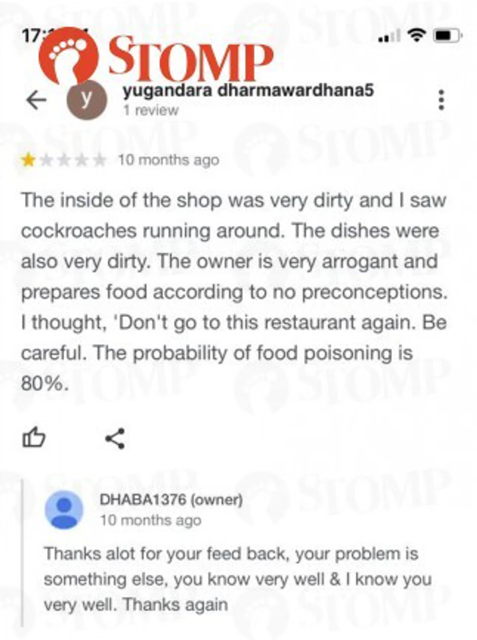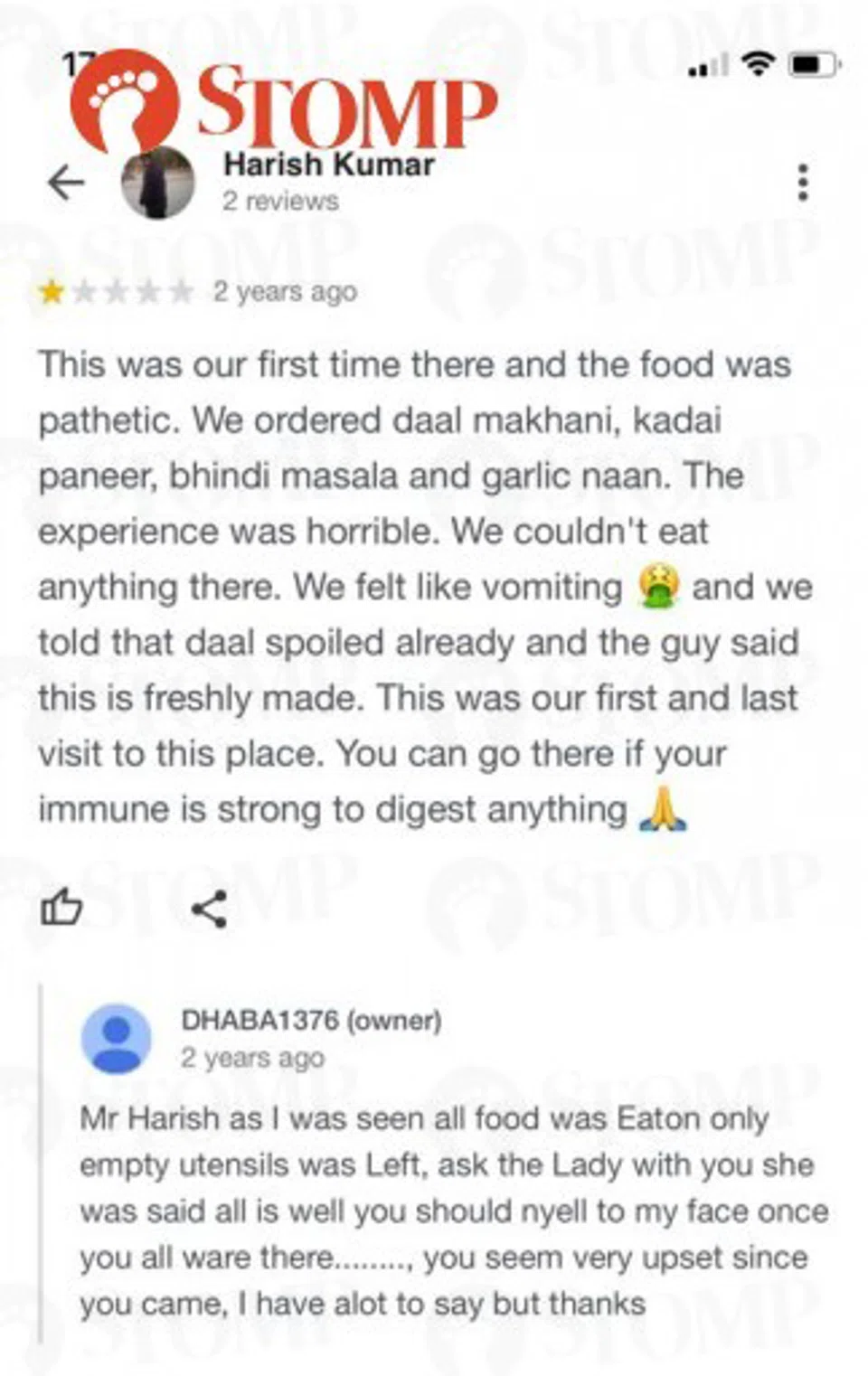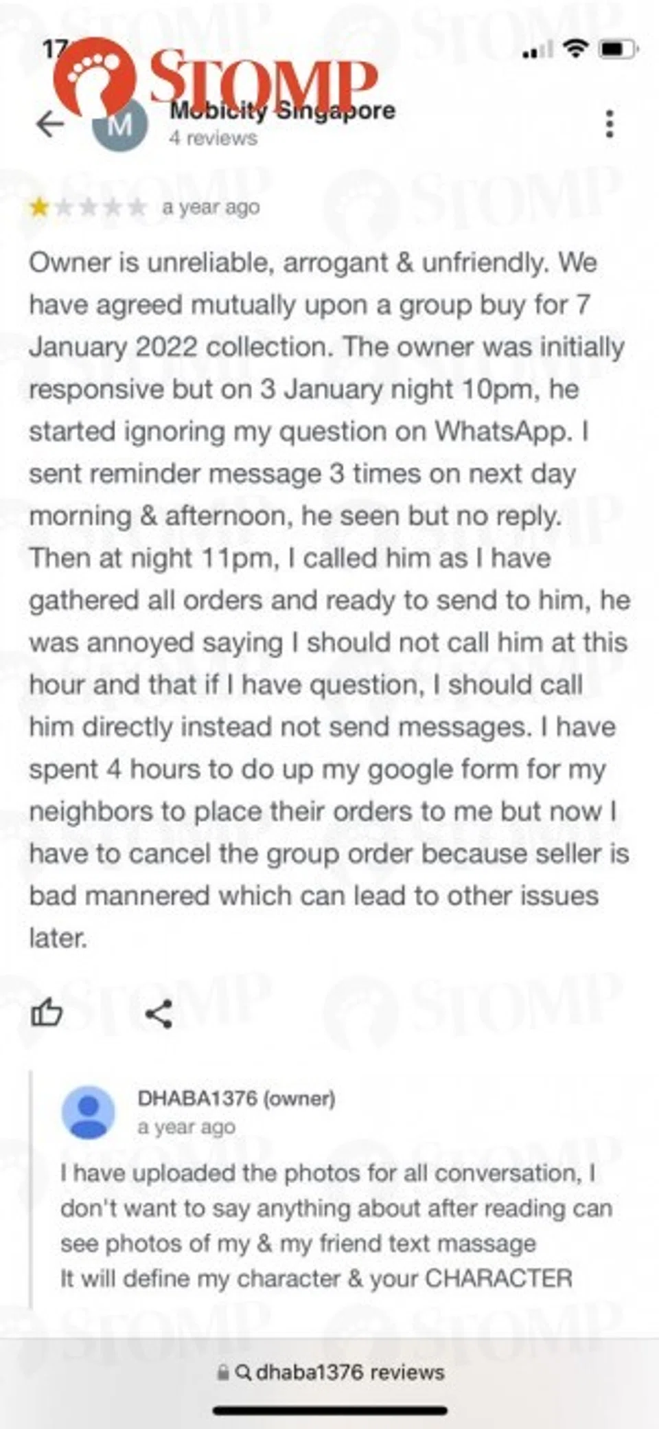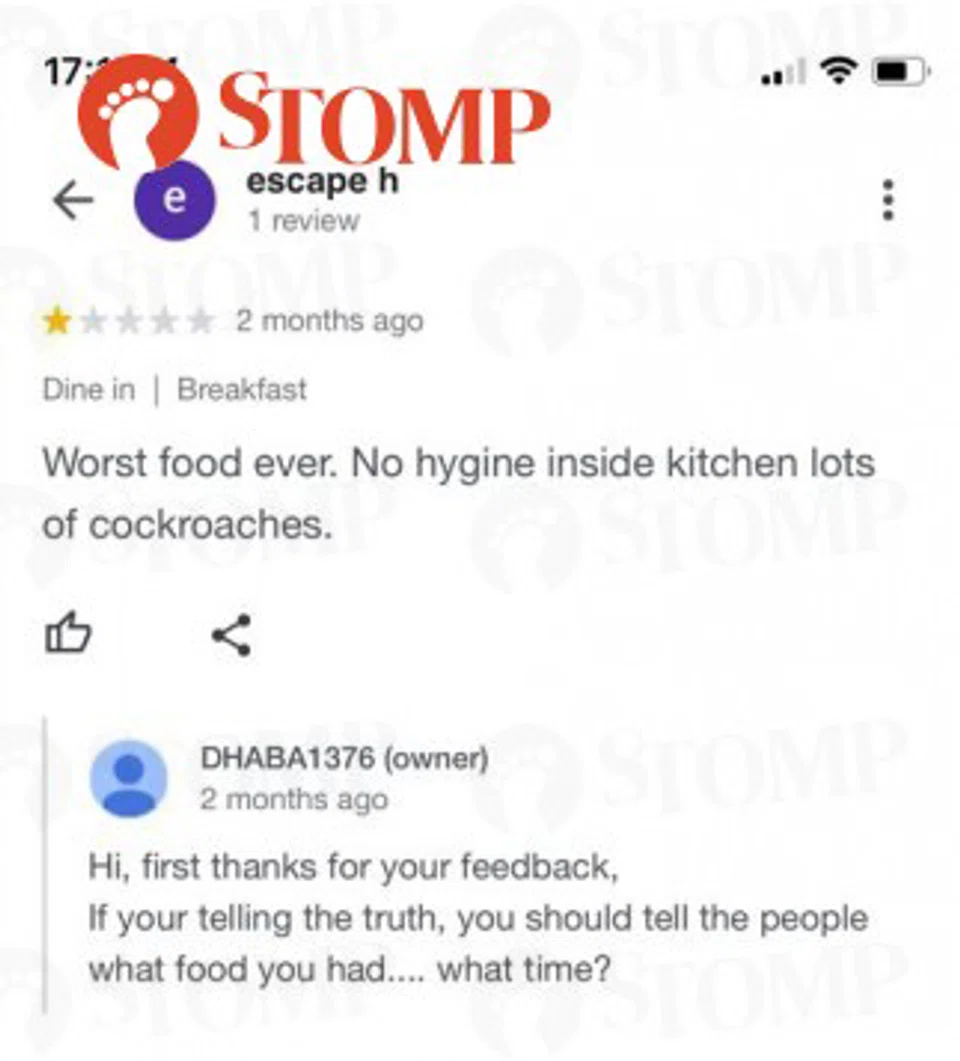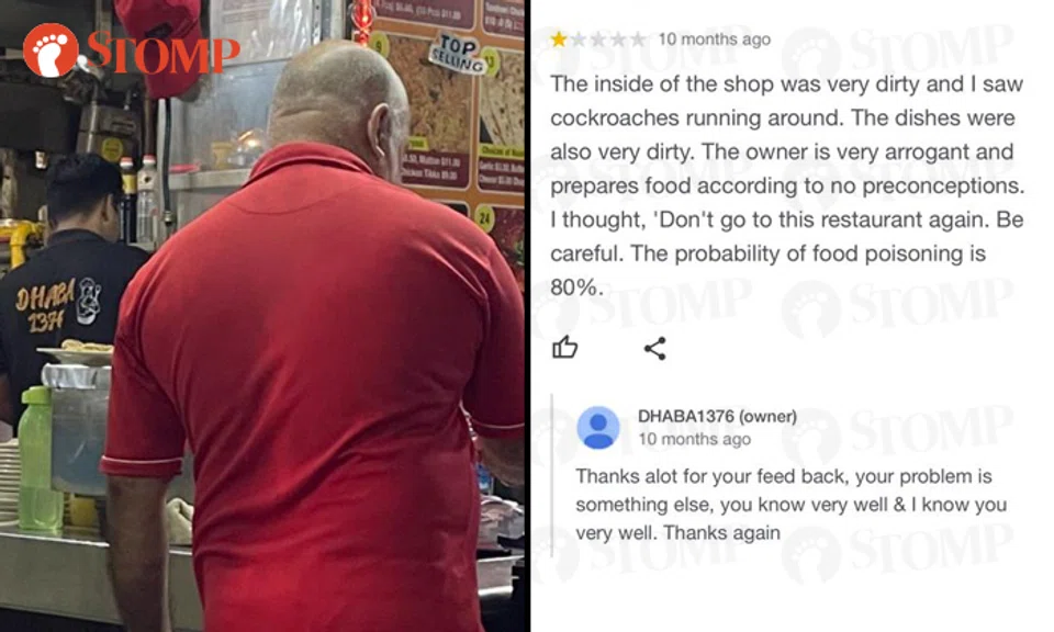 Woon shared screenshots of negative Google reviews that called out DHABA1376's hygiene standards and the stall's scathing responses.