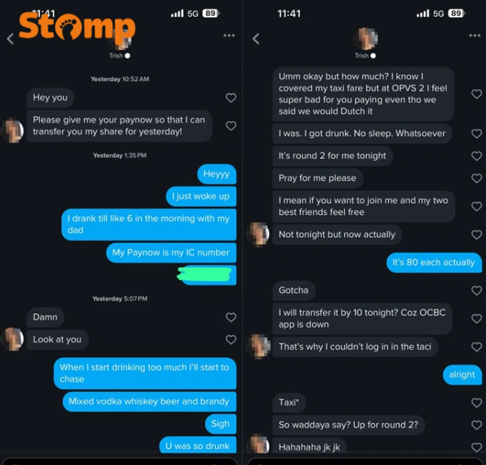 "She started talking rubbish, telling me that she had no PayNow while we were trying to pay for a cab to our next destination, so I paid again," Bee added.