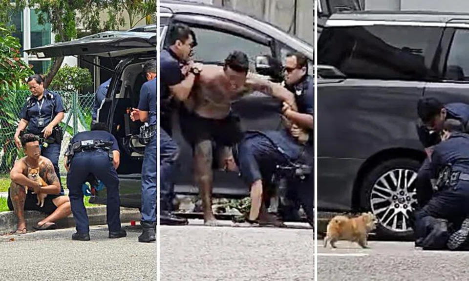 Photos taken by a Shin Min Daily News reader show that the man, who was shirtless, appeared to be holding a dog during the incident.