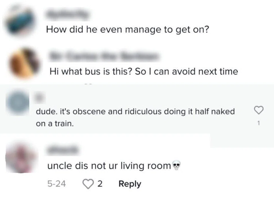 The New Paper June 23, 2023 No one wants to see you naked. That's the message netizens are sending a man who posted a number of TikTok videos of himself half-nude a bus and train.