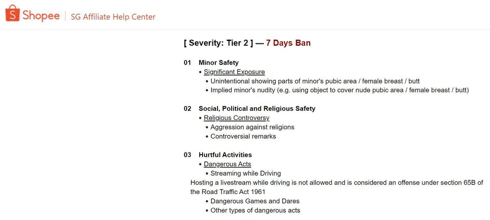 In the Shopee Live policy, streaming while driving is considered a dangerous act under hurtful activities and the penalty is a seven-day ban from livestreaming.