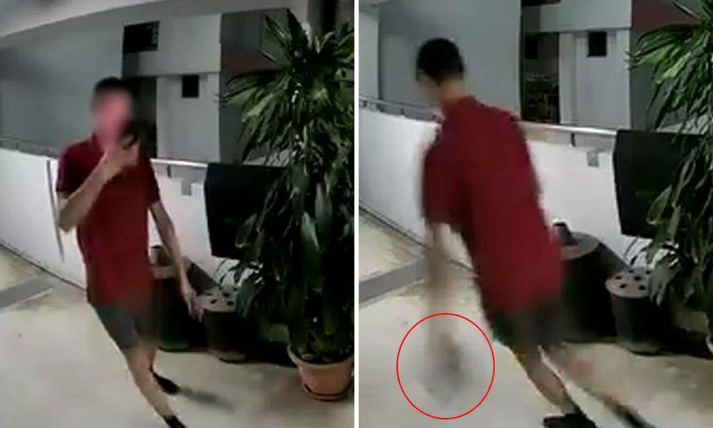 The clip, posted on Complaint Singapore’s Facebook page, shows the man in a red T-shirt taking a photo of the unit at about 8.36pm before bending down, picking up a parcel and walking away with it.