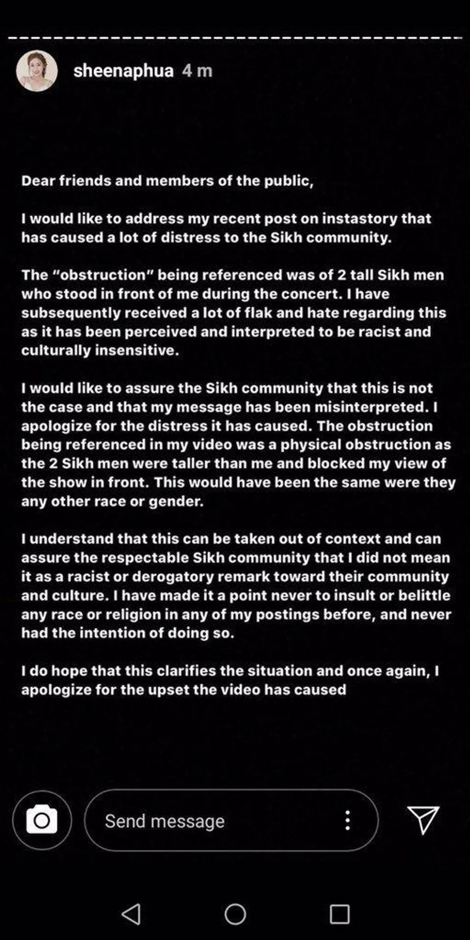 Sheena Phua, who has over 76,000 followers on Instagram, sparked backlash after posting an Instagram Story about two men who blocked her view of a concert at the Singapore Grand Prix last weekend.