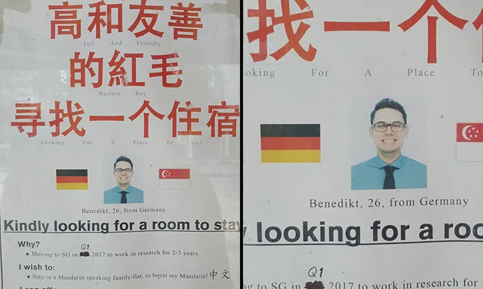 Posted on Twitter by user Izzati, the ad reads: "Tall and friendly western boy looking for a place to stay". The ad is also written in Chinese characters.
