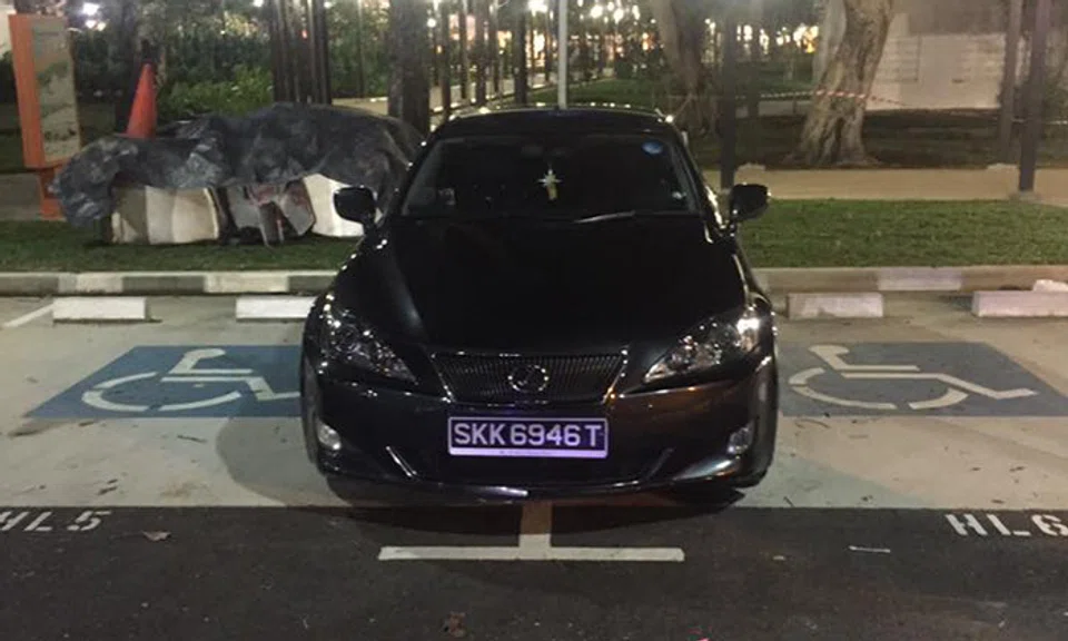 A photo showing a Singapore-registered car parked right in the middle of two handicap lots has gone viral online.