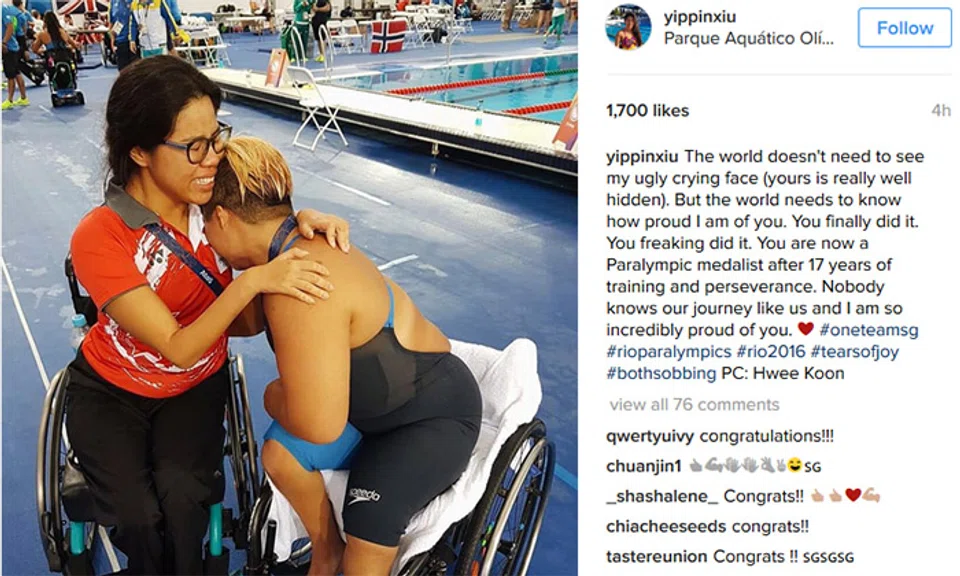In an emotional post on Instagram, fellow para-swimmer Yip Pin Xiu posted a photograph of her sharing a moment of embrace with Goh to celebrate the latter's win.