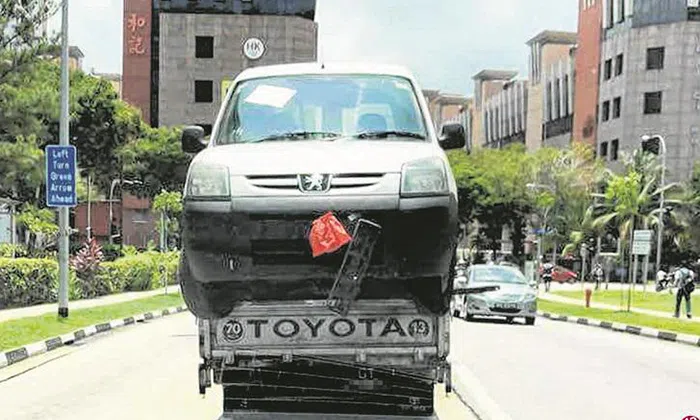 Peugeot 'hitches ride' on lorry's back at Kaki Bukit Ave 3: Car was unsteady with two wheels dangling outside