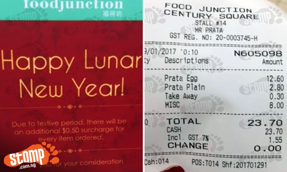 Photos they sent in also show signs put up at the food court, stating that there would be an additional $1 surcharge for every food item ordered and an extra $0.50 surcharge for every beverage ordered "due to the festive season".