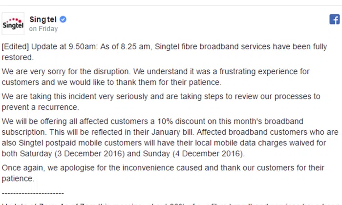 Singtel posted an update on its Facebook post on Sunday (Dec 4) to inform customers that its broadband services have been restored.