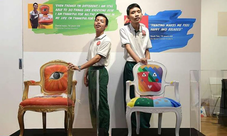 Painted by Rainbow Centre students Noah Tan and Danial Isaac, the chairs were put up for a silent auction at Ion Orchard yesterday with a starting bid of $20,000 each.