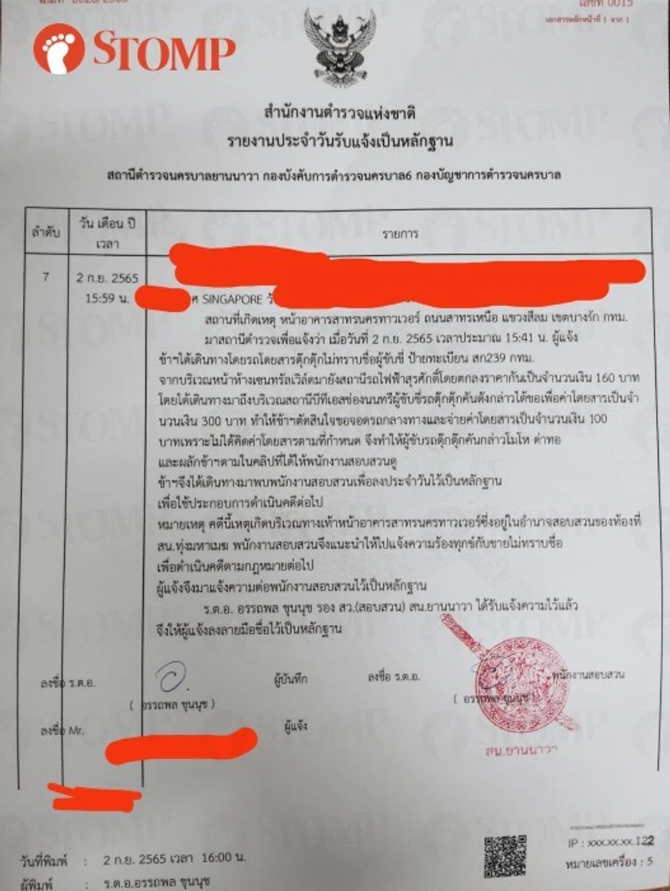 The Stomper continued: "Close to BTS Chong Nonsi, he said that our condo is too far and asked for 300 baht. I did not agree. I told him if he did not want to go farther than BTS Surasak, then we will stop at BTS Surasak and pay him 160 baht as agreed.