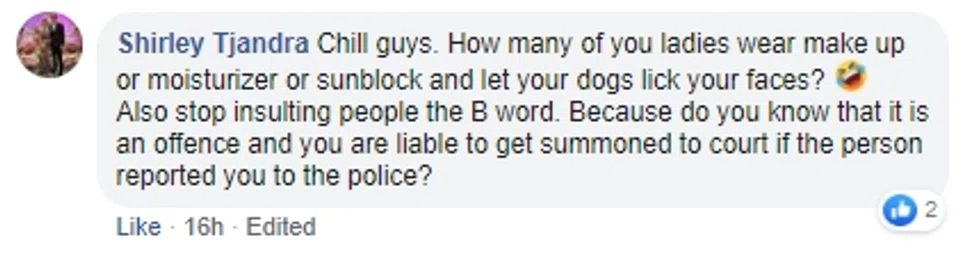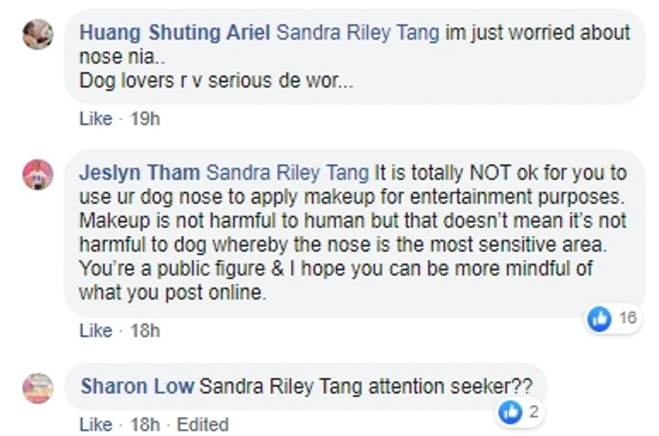 Local singer and actress Sandra Riley Tang has responded to backlash from netizens after a Tik Tok video of her applying concealer with her dog's nose was posted in an animal lovers' group on Facebook.