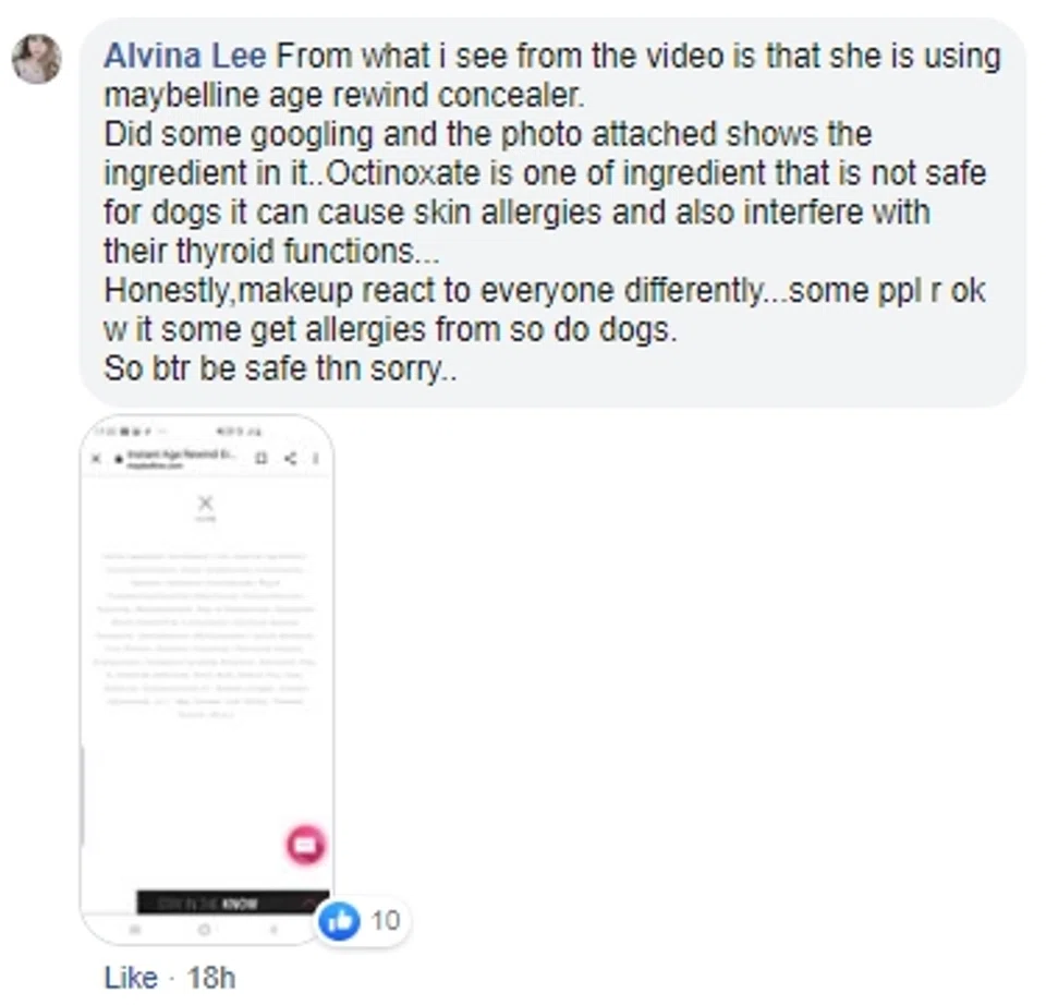 One commenter looked up the ingredients found in the Maybelline concealer Tang had used and alleged that at least one of them is unsafe for dogs as it can cause skin allergies.