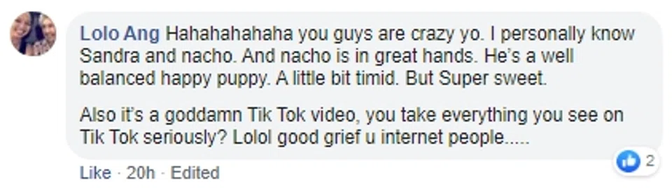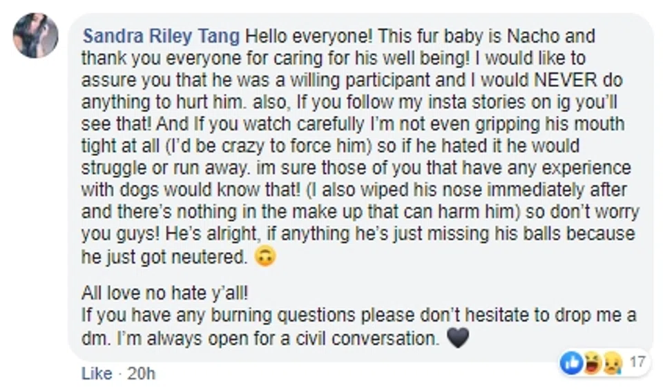 At about 3pm on Tuesday, Tang commented on the video to clarify that she would never do anything to harm Nacho and that his well-being was not compromised in the video.