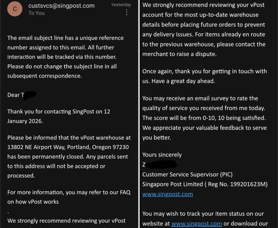 In response to a Stomp query, a spokesperson for SingPost, which operates vPost, said: "We acknowledge that a miscommunication occurred with the affected customer regarding the vPost US Warehouse 2 address.