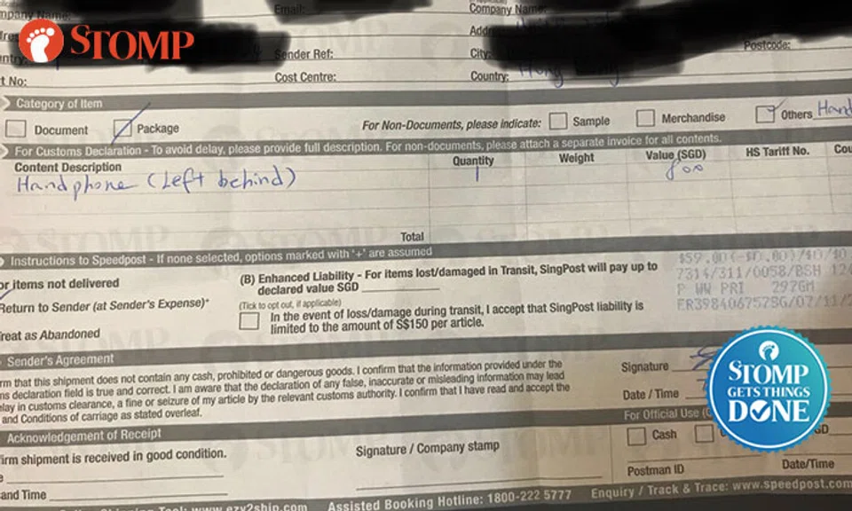 Upon realising he had forgotten to bring his phone, Denny got in contact with his family and his mother subsequently engaged SingPost's Speedpost Priority service on Nov 7 to deliver a parcel containing his phone to Hong Kong.