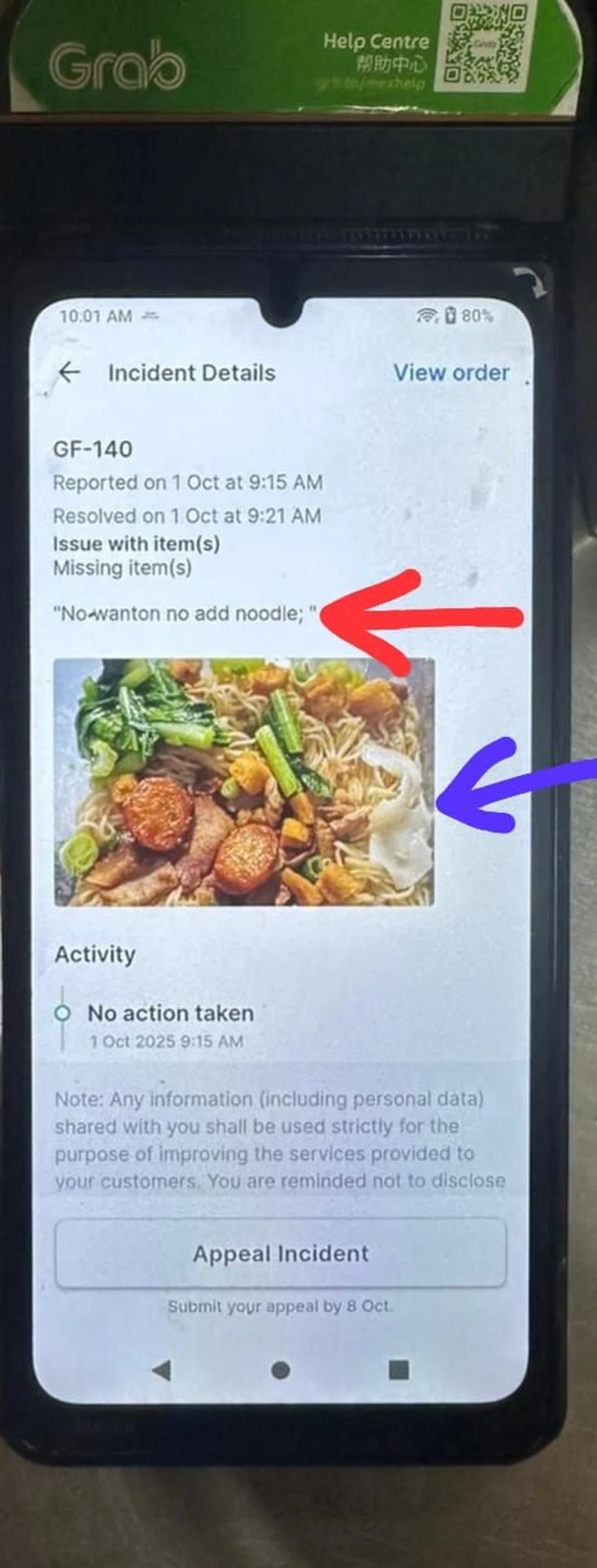 "He still removed the items himself, snapped a photo, and filed a complaint to Grab," the stall wrote.