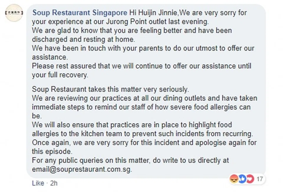 "The reported food allergy incident at Soup Restaurant Jurong Point outlet last evening serves as a reminder to all F&B outlets of how severe food allergies can be.