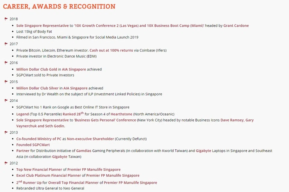 He also said he was the "sole Singapore representative" in 2018 to attend the 10X Growth Conference in Las Vegas and 10X Business Boot Camp in Miami.
