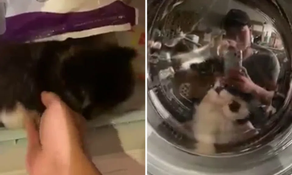 In another video, the kitten is seen inside a washing machine with its door closed before the man opens it and is heard laughing.