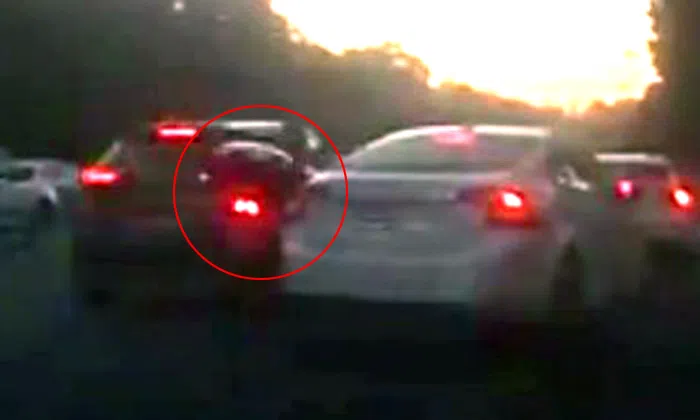 The clip shows traffic coming to a standstill, so one driver tries to abruptly switch lanes.
