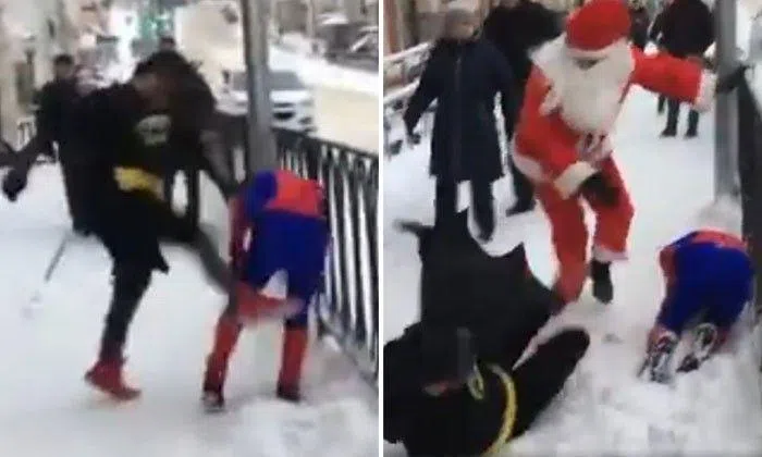 A video circulating on Facebook shows Spiderman, Batman and -- believe it or not -- Santa Claus, involved in a Royal Rumble of sorts at a snow-covered pavement believed to be in Russia.