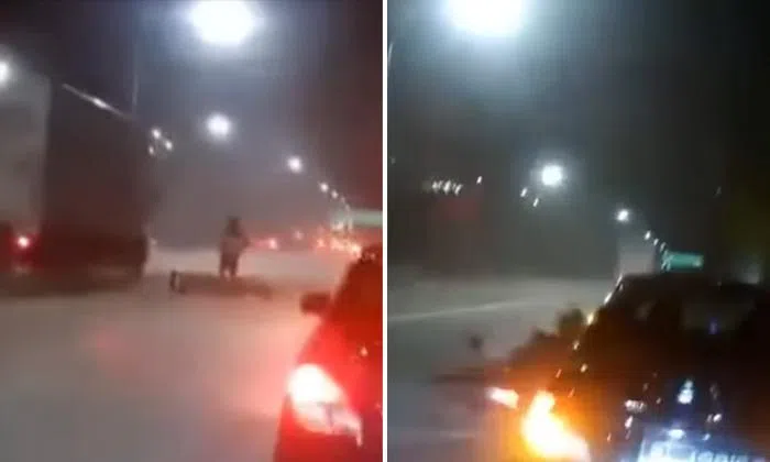 The video posted shows the gravel spilled on the expressway, with a motorcyclist standing in the middle of the road. Soon after, another motorcyclist can be seen falling on the gravel and skidding a few metres away.