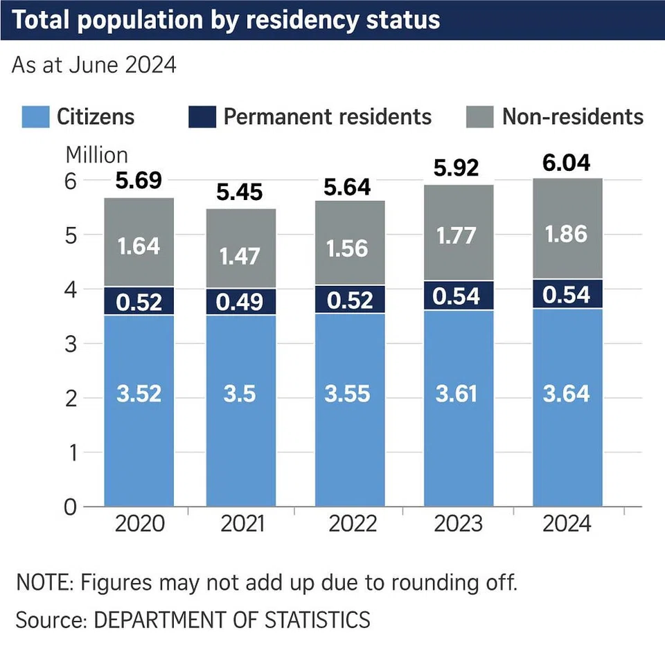 The increase was due mainly to a 5 per cent increase in the non-resident population, which grew from 1.77 million in June 2023 to 1.86 million in June 2024, said the annual report released on Sept 24 by the National Population and Talent Division (NPTD).