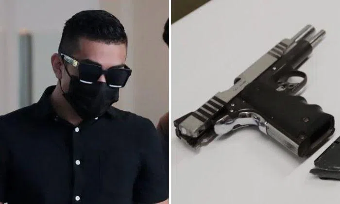 Amirul Asyraff Muhammad Junus pleaded guilty on Monday (Oct 11) to one charge of consorting with Muhammad Ikram Abdul Aziz, 26, who was in unlawful possession of a Shooters Sea Hawk pistol and eight bullets. He also admitted to a second charge of possessing a baton in a public place.