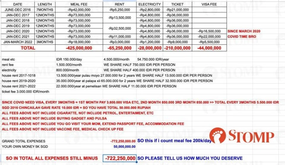 She shared screenshots of her ex's WhatsApp messages, where he asked for 250 million rupiah (S$20,700) from her.
