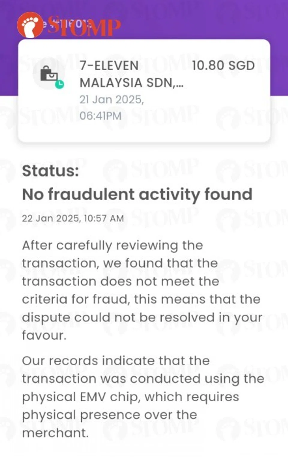 However, Diana realised that there were already three unauthorised transactions made in Malaysia using her card. Two transactions of RM35.40 (~S$10.80) and RM6.40 (~S$1.95) were made to 7-Eleven stores while a RM5 (~S$1.50) transaction was made to Yuxiaoer Mart.