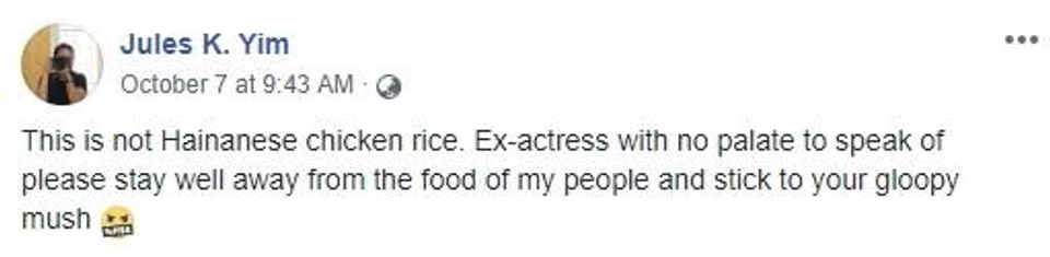 Facebook user Jules K. Yim, a Singaporean living in London, posted a photo of the recipe on Oct 7 with the caption: "This is not Hainanese chicken rice. Ex-actress with no palate to speak of please stay well away from the food of my people and stick to your gloopy mush."