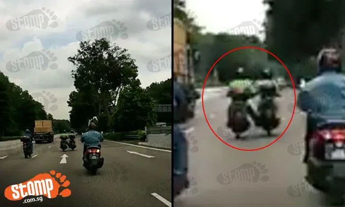 Two motorcyclists occupied the middle lane on the BKE towards Woodlands on Tuesday (May 9) at around 12.30pm, with one rider even placing his foot on the other’s vehicle while the two chatted -- despite the oncoming traffic.