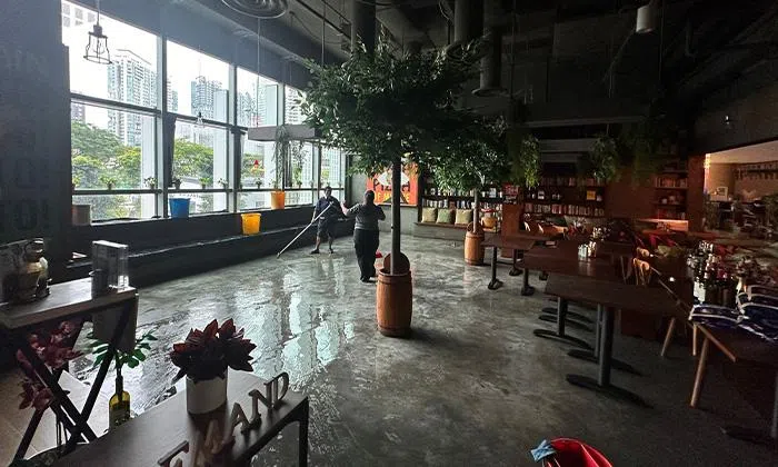 “Due to construction mishaps on the mall’s end, a sprinkler system was damaged, causing water to leak uncontrollably across our dining area.