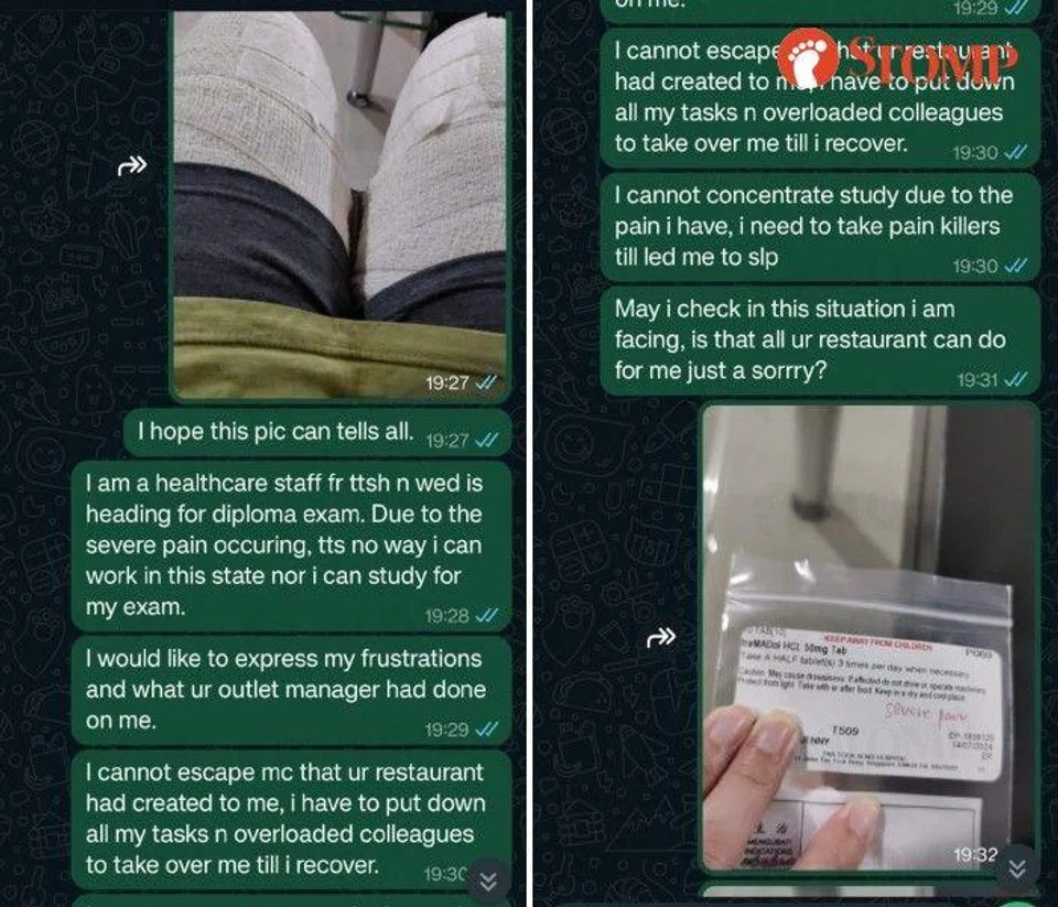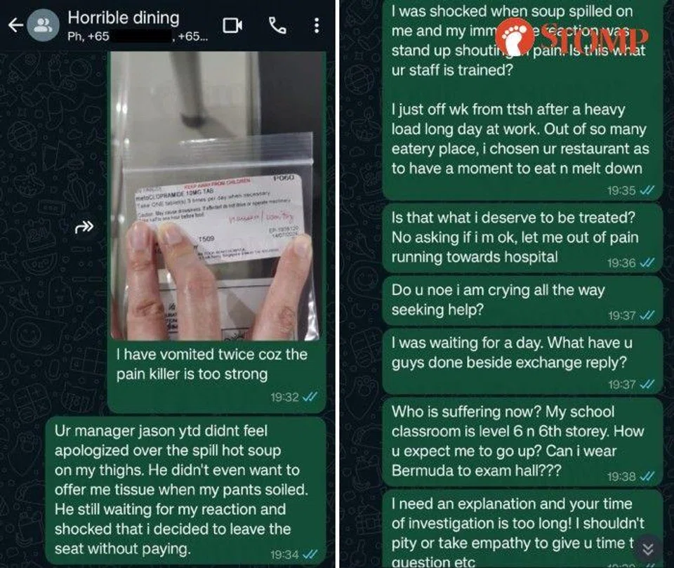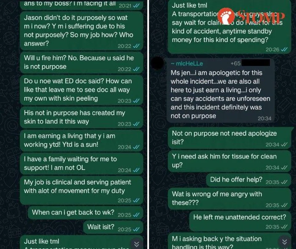 "After that I proceeded to the Emergency Department at Tan Tock Seng for my treatment. I was crying all the way there because no one helped me. I was alone," said the Stomper, who was diagnosed with second-degree burns.