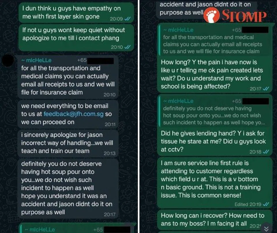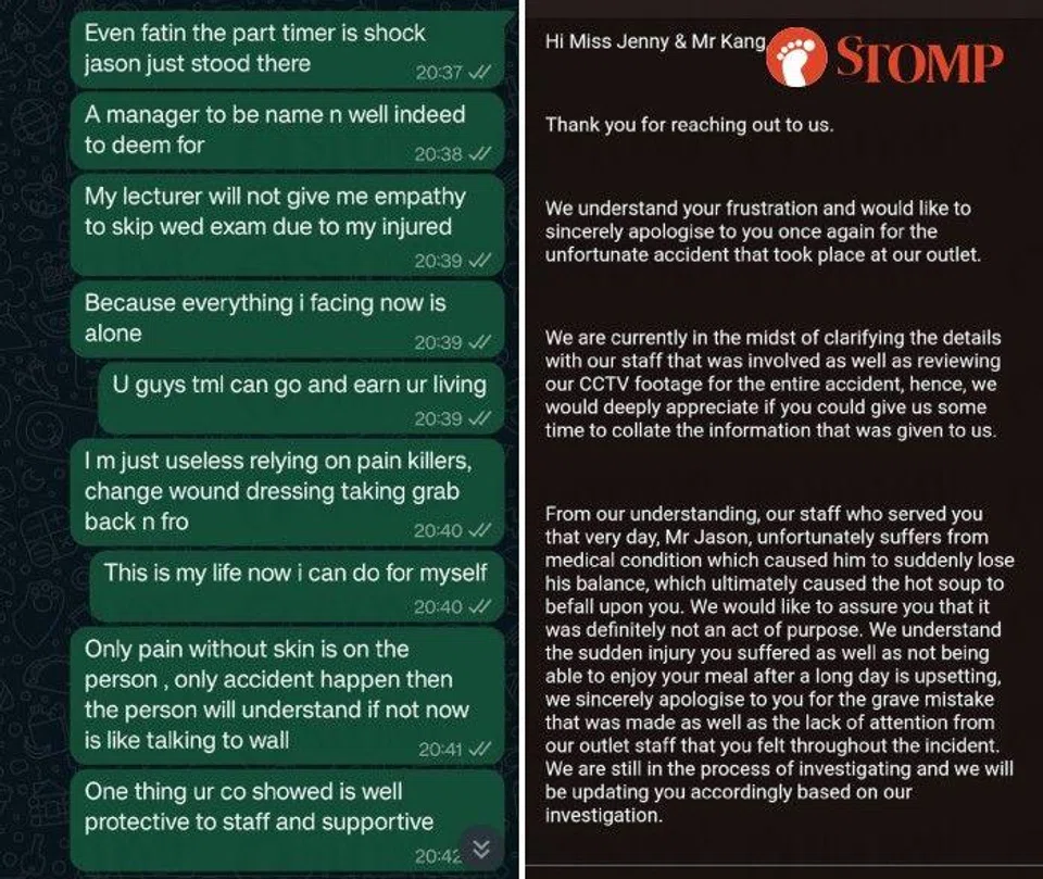 In a reply to her, Japan Foods Holding, which operates the restaurant, said: "From our understanding, our staff who served you that very day, Mr Jason, unfortunately suffers from medical condition which caused him to suddenly lose his balance, which ultimately caused the hot soup to befall upon you.