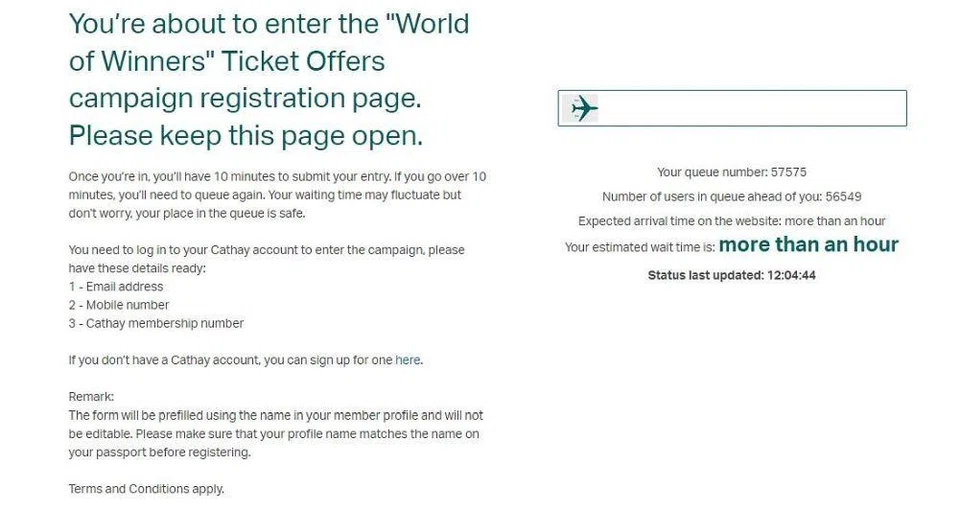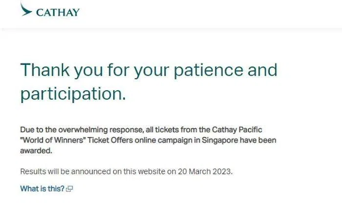 As at 1.20pm, a message on the airline’s giveaway website said: “Due to the overwhelming response, all tickets from the Cathay Pacific ‘World of Winners’ Ticket Offers online campaign in Singapore have been awarded.”