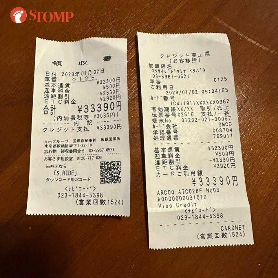 The Stomper shared photos of two taxi receipts in Japanese. The fare stated in each is 33,390 yen.