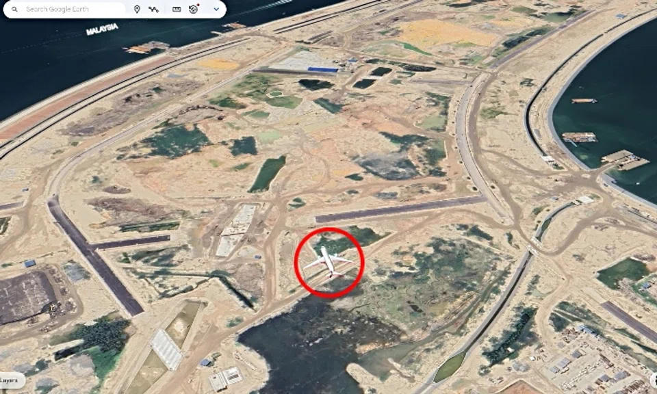 The aircraft was likely not on the ground but flying in the air above Pulau Tekong when the image was captured by a satellite camera.