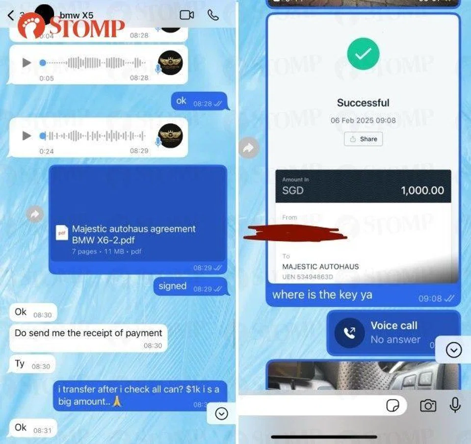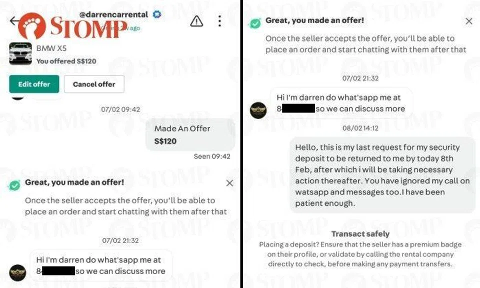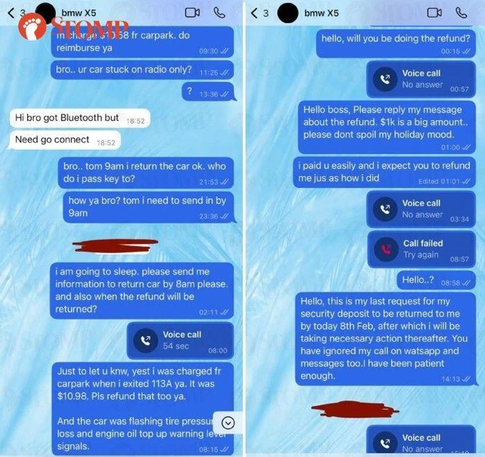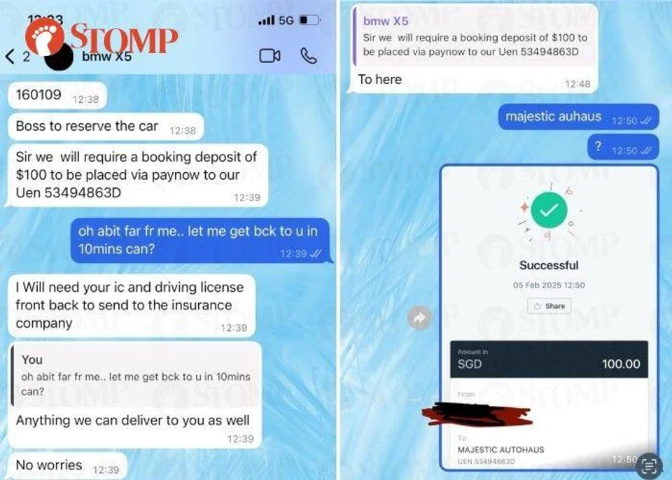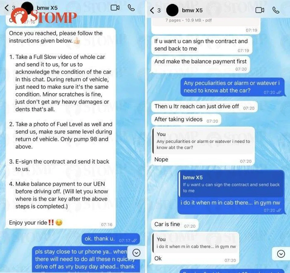 "He later called me on WhatsApp to tell me that the car has been booked and informed me that there is refundable security deposit of $1,000 I had to transfer to him via PayNow. He also required a snapshot of my IC and driving license, which are the standard documents needed to rent a car, to draw up the rental agreement.