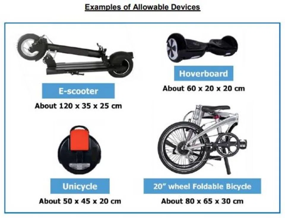 An example of an allowable device is a foldable bicycle with 20-inch wheels and dimensions of 80cm by 65cm by 30cm.